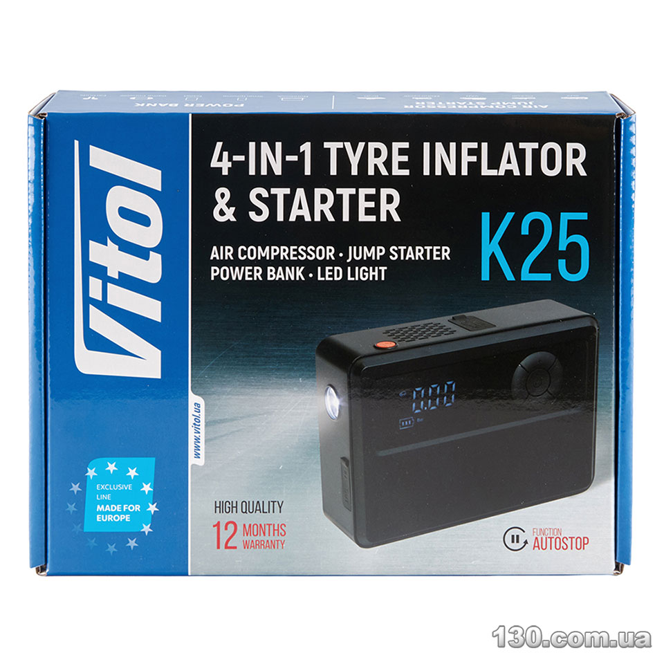 Ви можете купити компресор автомобільний (насос) Vitol K-25 4in1/14.8V/22.2wh/6000mAh/Бустер/Повербанк/Ліхтар у Києві, Львові, Запоріжжі, Вінниці, Івано-Франківську, та інших містах (доставка кур’єром по місту та Україні). Можлива безготівкова передоплата на розрахунковий рахунок, онлайн оплата пластиковою карткою Visa / MasterCard або оплата за товар на місці — при отриманні.